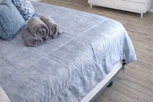 “Bright and airy attic bedroom featuring a plush queen bed, soft linens, and a Smart TV for relaxing nights in. The neutral tones and sloped ceilings create a cozy yet spacious retreat.”