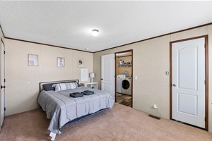 Spacious master bedroom with a comfortable queen bed, soft carpeting, and easy access to the laundry area for added convenience.