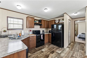 Spacious kitchen with wraparound counters, black appliances, and direct access to nearby bedrooms for added convenience.