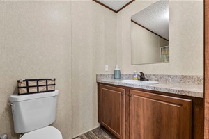 Clean and functional bathroom with a spacious vanity, large mirror, and ample counter space for your daily routine.